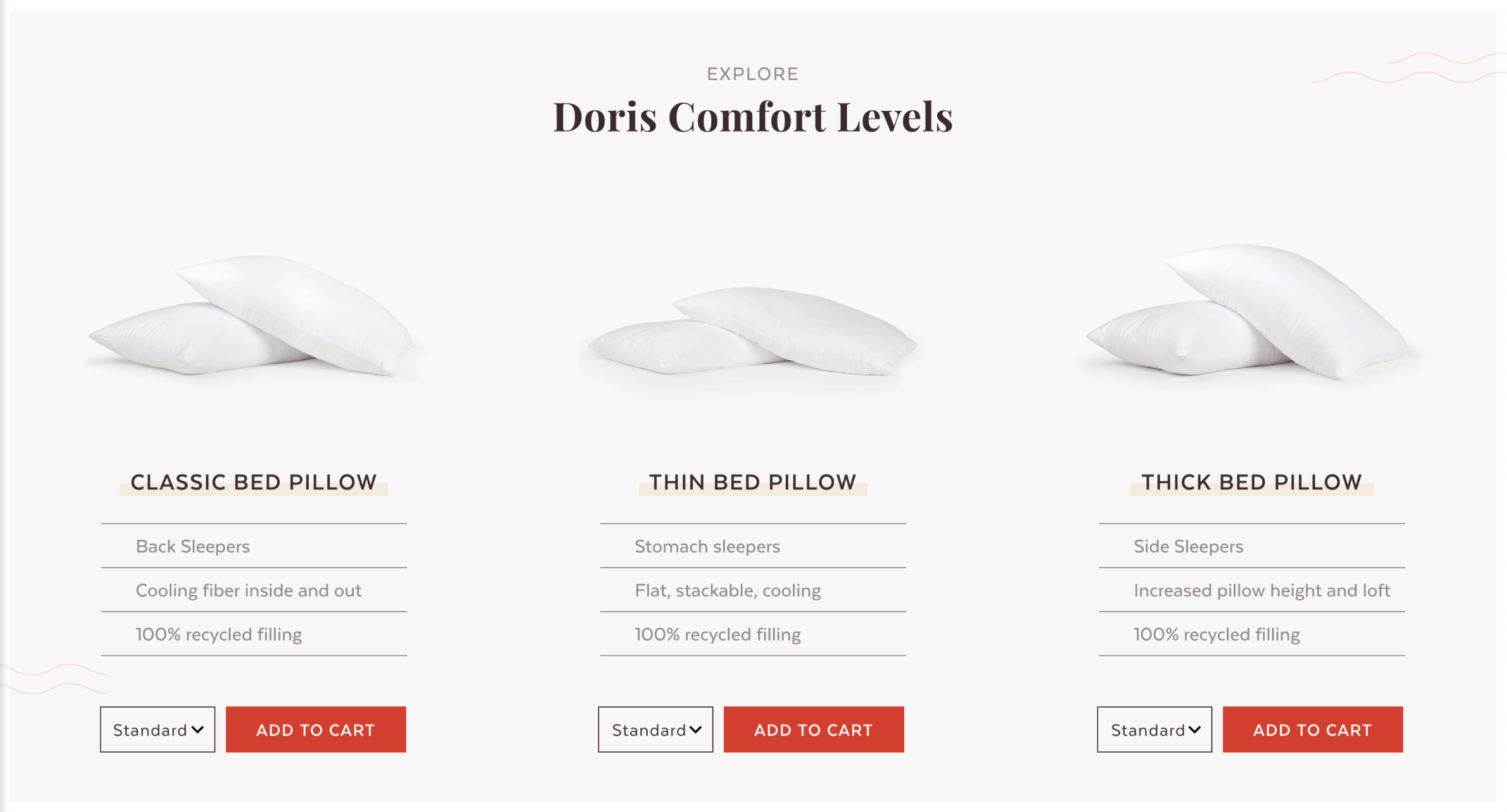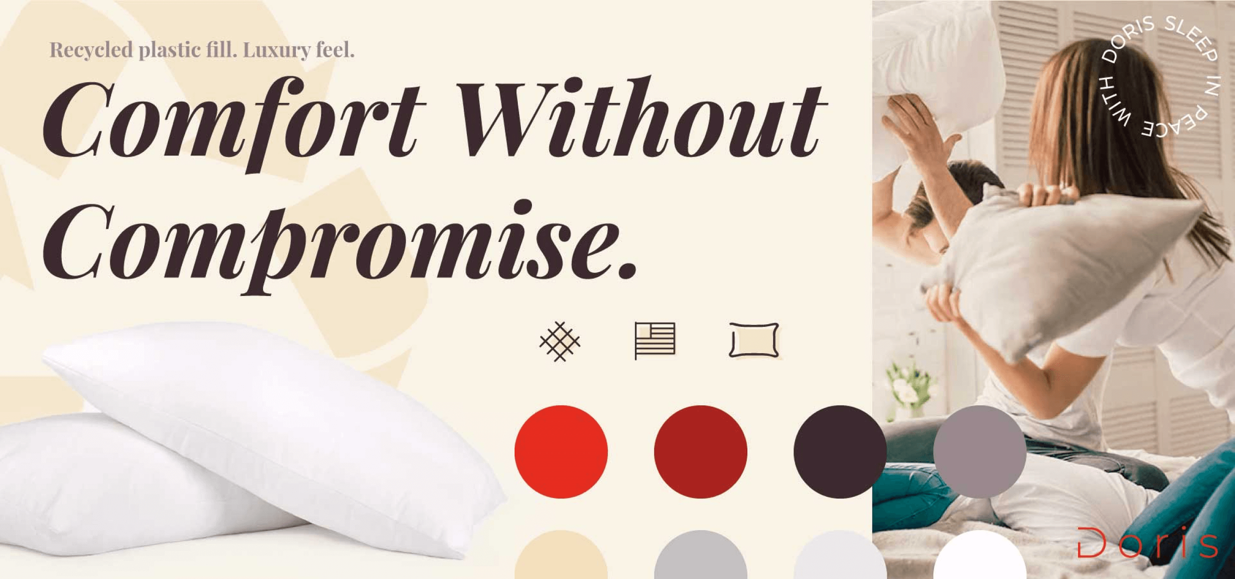 Doris is a female-founded and third-generation owned pillow company making strides in the industry to provide high quality and luxurious feeling pillows with a recycled plastic fill. Their pillow fill is made from rPET-certified factories, giving jobs to local communities across the country. For its first DTC website, the brand needed help crafting a digital visual identity as well as telling its unique story.