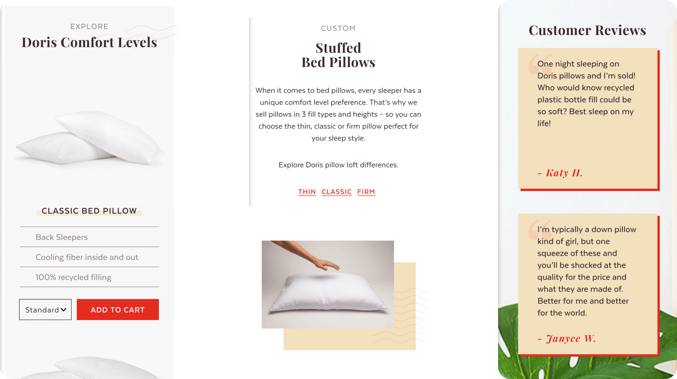 Doris had an initial brand identity concept that was expanded and translated to the website for a premium yet authentic look and feel. The overlapping layers, badges, and graphics add a sense of movement and dynamism that complement the pillow gifs. Robust and detailed product pages were built to stand on their own and answer all of users' questions and concerns. Product education is dispersed across the site as well as reviews and social proof to increase conversions.