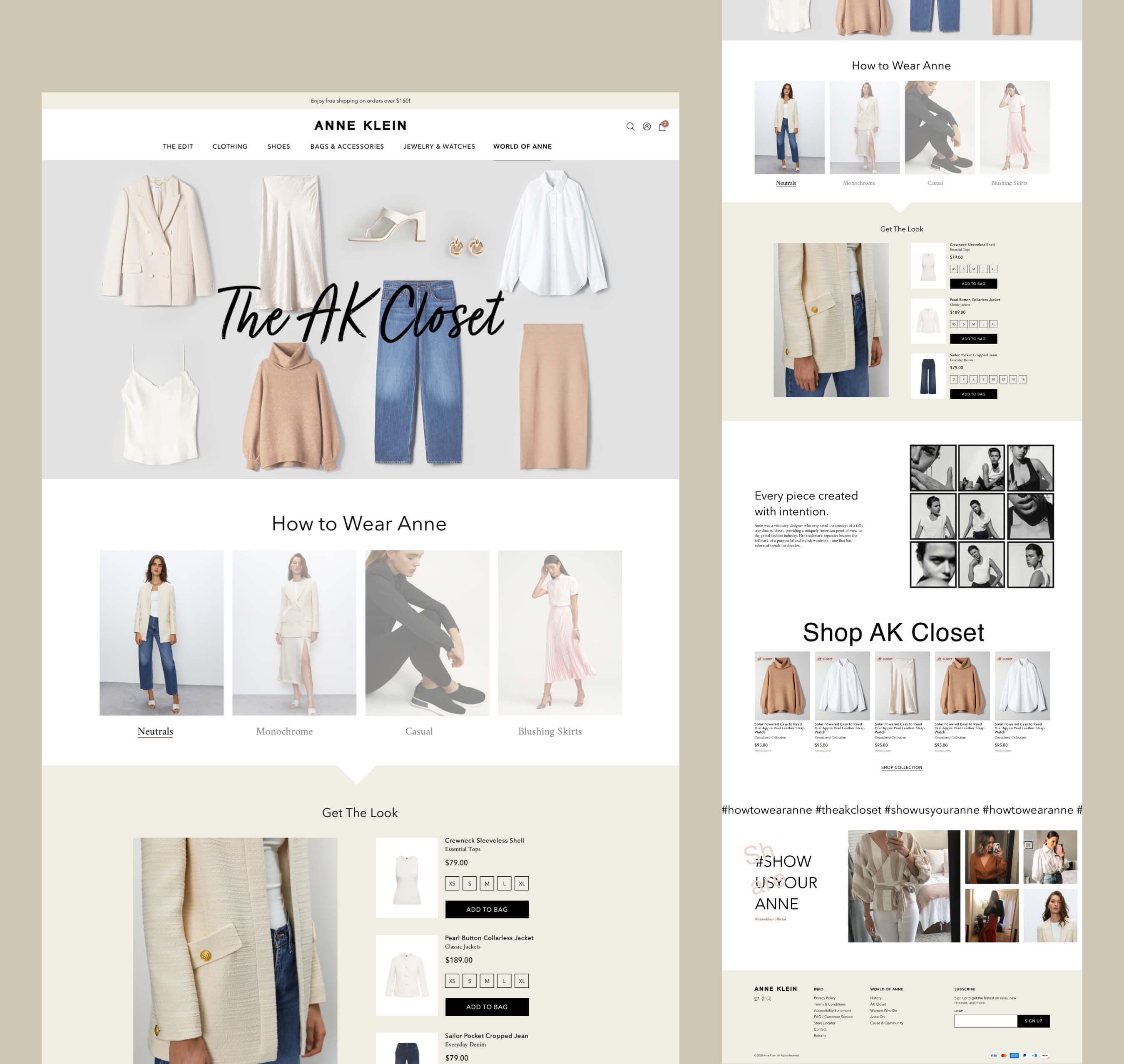 The resulting experience balances editorial sophistication with everyday ease. A refined black-and-white foundation, soft neutrals, and expressive typography create a polished yet approachable aesthetic, while dynamic layouts nod to fashion editorial design. The site seamlessly blends commerce and content, offering intuitive shopping alongside outfit-building tools, personalized recommendations, and rich storytelling through The World of Anne—positioning Anne Klein as the go-to modern workwear brand for women on the move.