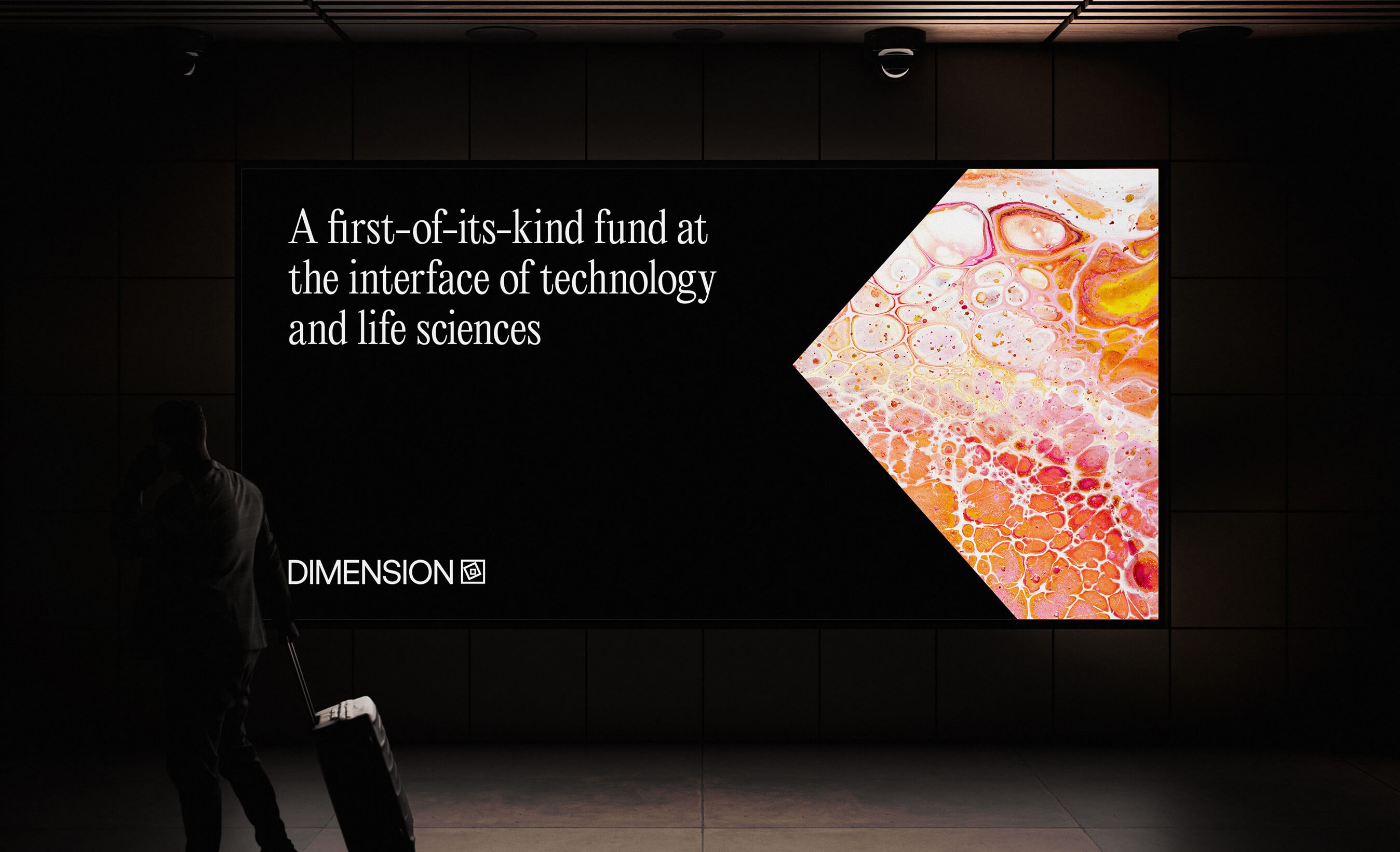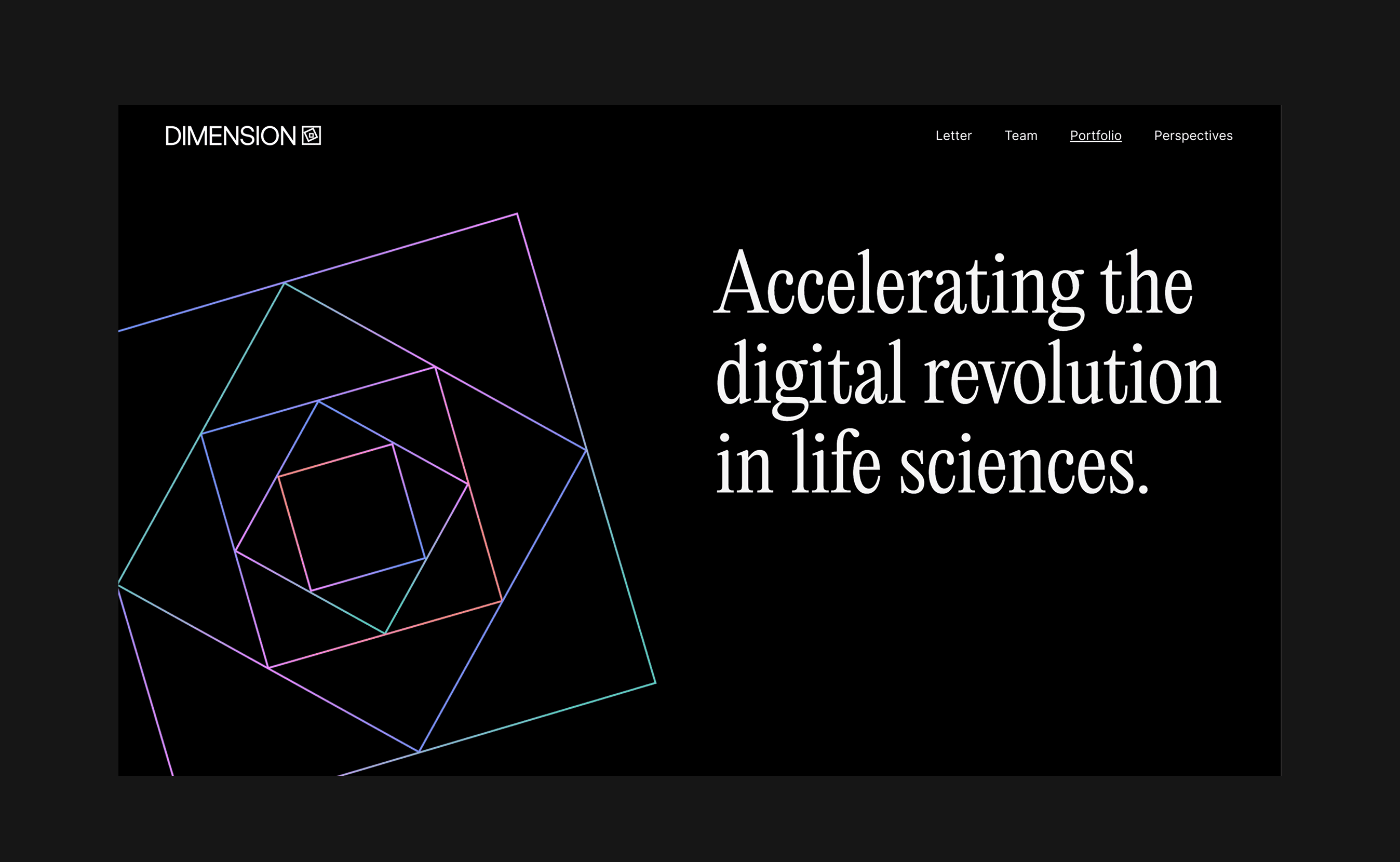 The identity draws inspiration from the awe of scientific discovery, using animated linework as a metaphor for doors opening to new possibilities. Refined typography and abstract interpretations of biology and technology position Dimension as both authoritative and expansive. On the website, immersive motion, bold typographic moments, and high-contrast compositions guide users through complex ideas with clarity—creating an experience that feels forward-looking, intentional, and quietly powerful.