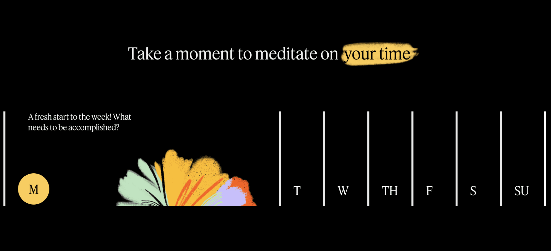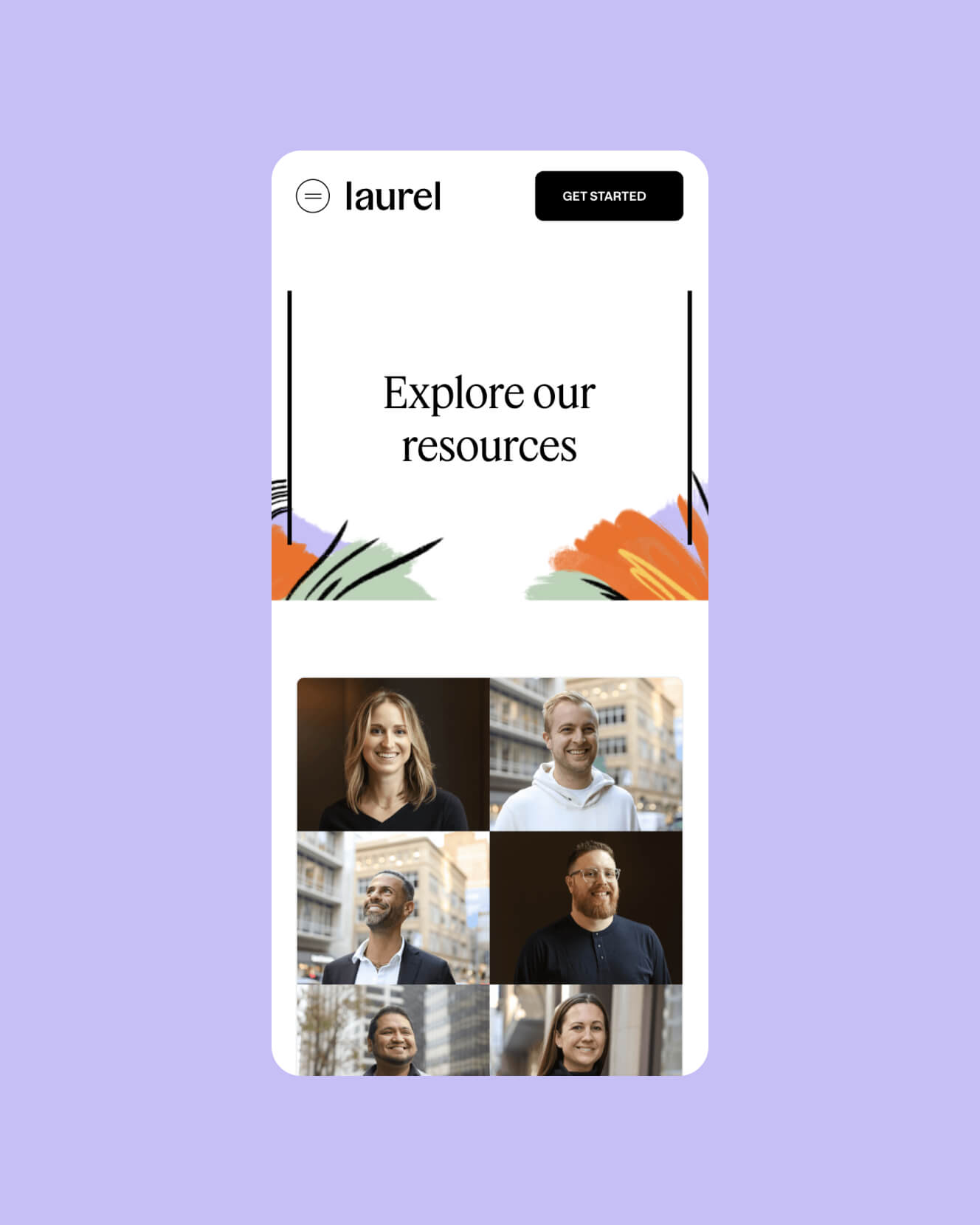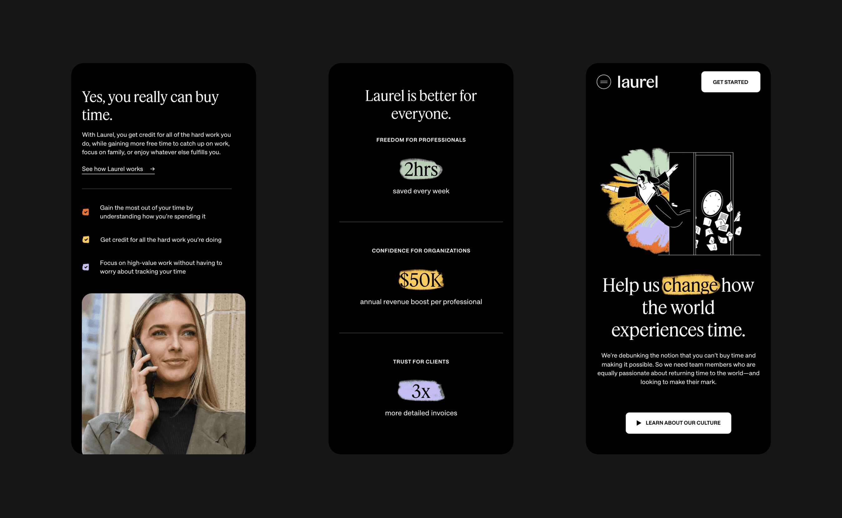 We reimagined time as a visual system—finite yet flexible—using timelines, bars, and motion to express structure, while vibrant, organic illustrations conveyed the freedom and possibility of reclaimed time. A restrained black-and-white foundation kept the brand professional, while bold color brought warmth and approachability. On the website, clear wayfinding guides multiple audiences through Laurel’s product and purpose, pairing thoughtful page intros with proof points that build credibility and momentum.